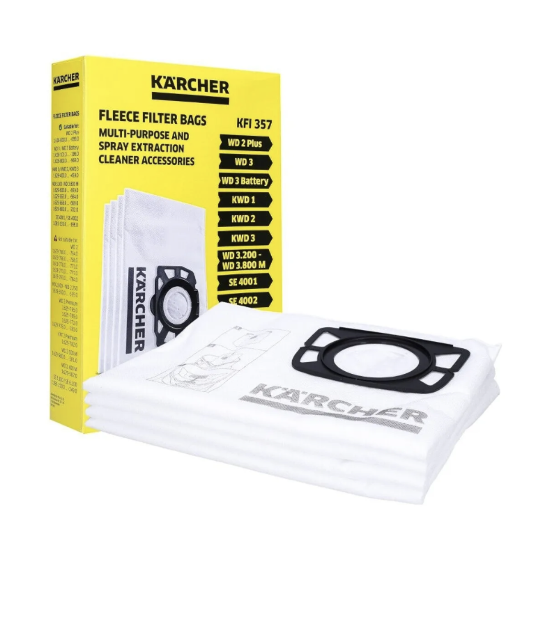 La bolsas de filtro de fieltro son compatibles con las aspiradoras en seco y húmedo WD 2 Plus, WD 3, WD 3 Battery y KWD 1 a KWD 3 de Kärcher, así como a las lava-aspiradoras SE 4001 y SE 4002 .