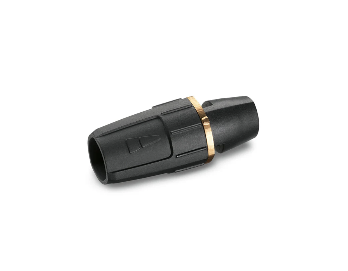 Boquilla triple de conmutación manual. Robusta, duradera y resistente a la suciedad. Cómodo cambio del tipo de chorro entre chorro concentrado de alta presión (0°), chorro plano de alta presión (25°) y chorro plano de baja presión (40°). En equipos con inyector, el chorro plano de baja presión sirve para aspirar y proyectar el detergente. Conexión M 18 x 1,5.