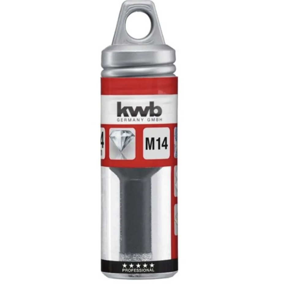 Cortes con revoluciones elevadas sin refrigeración adicional, sierra de corona revestida con diamantes industriales, diámetro de 6 mm hasta 14 mm con una profundidad de corte de 35 mm, diámetro de 20 mm hasta 68 mm con una profundidad de corte de 45 mm, rosca de alojamiento M14, práctico envase de tubo de rosca reutilizable, para baldosas, cerámica, gres, porcelanato, gneis, granito, mármol y pizarra.