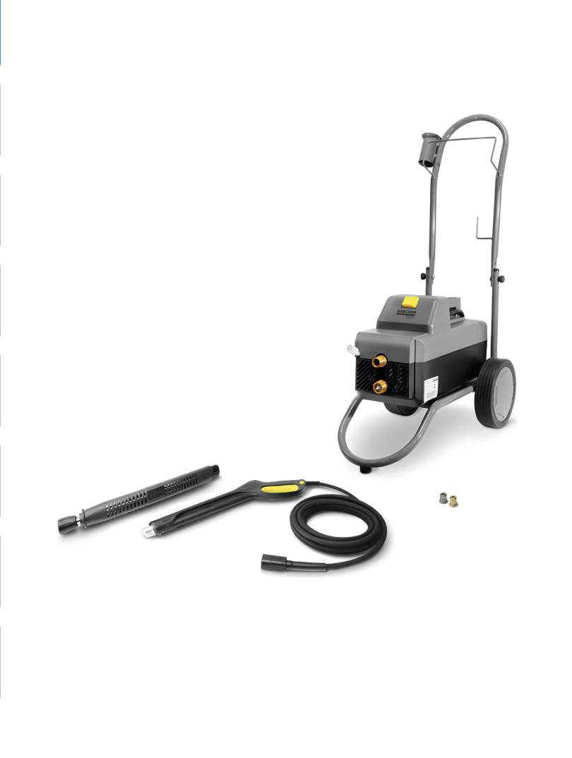 Esta lavadora a presión de agua fría compacta es el modelo ideal para usuarios comerciales finales. La HD 585 cuenta con impresionante movilidad, compacidad y cuenta con características Karcher como: una cubierta de plástico resistente a los golpes que protege la bomba de alta presión de los daños y la suciedad. Otras muy buena característica es un compartimento de boquilla en la parte posterior de la unidad. Se puede elegir entre una boquilla de punto de alta presión, una boquilla de alta presión de 25 grados y una boquilla de baja presión de 25 grados. La boquilla de baja presión (40 Grados) se utiliza para dispensar el agente de limpieza. Permite que el producto de limpieza se mezcle continuamente con el chorro de alta presión. La bomba axial de tres pistones con pistones de acero inoxidable y una cabeza cilíndrica garantiza una larga vida útil y baja susceptibilidad a fallas. La salida de alta presiónes de metal, que los hace muy resistentes a la fractura y a la corrosión.