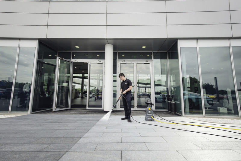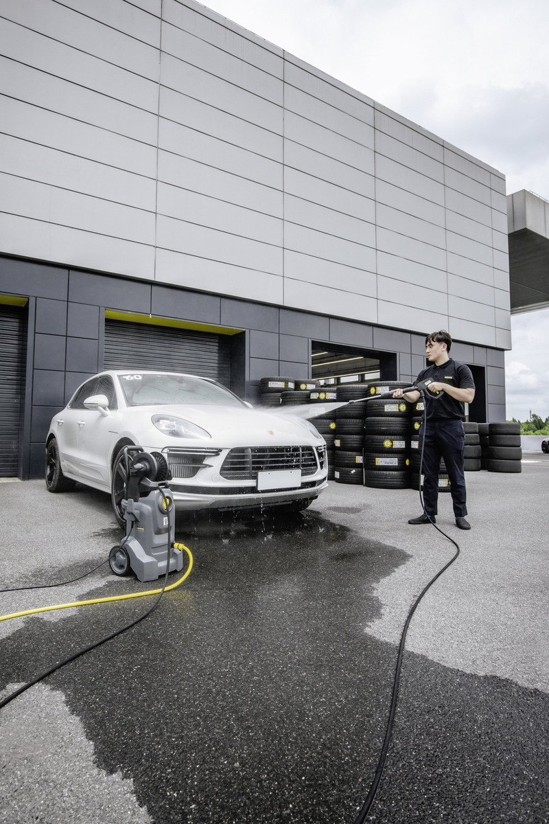 Hidrolavadora compacta HD 4/10 X Classic con descarga automática de presión y enrollador de mangueras integrado. Diseñada para ser ergonómica y fácil de mover gracias al tirador retráctil y a las ruedas robustas.