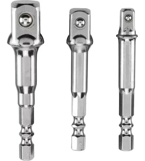Juego de adaptadores para vasos 3 piezas, cromo vanadio, cromado brillante, para todas las llaves de vaso estándar con 1/4″, 3/8″, 1/2″, vástago hexagonal 1/4″ según ISO 1173, E 6.3.