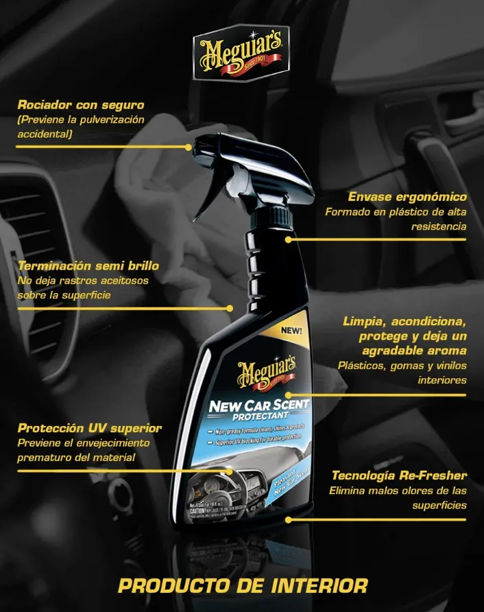 Meguiar´s New Car Scent Protectant es nuestra nueva fórmula versátil que limpia, acondiciona, abrillanta y protege las superficies de tu interior, dejando a su vez un refrescante aroma New Car y en conjunto con toda la tecnologia Re-Fresher que elimina los olores no deseados de todas las superficies aplicadas. El nuevo New Car Scent Protectant te ayudara a eliminar la suciedad diaria, proporcionando una intensidad en el color de tus tableros y un brillo satinado en tus superficies de vinilo, gomas y plásticos. Sus agentes protectores UV y su tecnología eliminadora de olores Re-Fresher, te permitirán mantener tu interior como nuevo, protegido y con la cautivante fragancia New Car que todos deseamos.