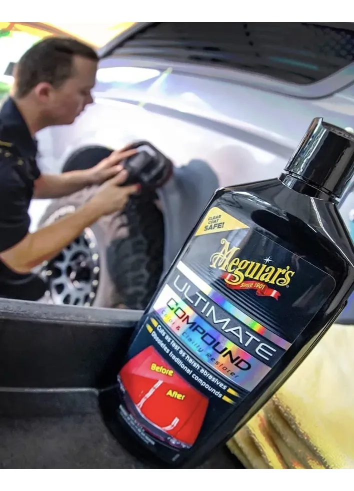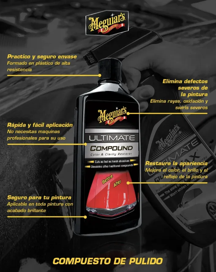 Pasta de Pulir para Autos Meguiars Ultimate Compound Ultimate Compound de Meguiar’s restaura el color y la claridad de las superficies descuidadas, removiendo rayas y hologramas con mayor fuerza que otros productos de corte. Nuestra formula revolucionaria limpia rápidamente la superficie de tu pintura, sin dañar los acabados transparentes y esta creado especialmente para ser utilizado a mano con un pad aplicador, con toalla de microfibra o con maquina pulidora.