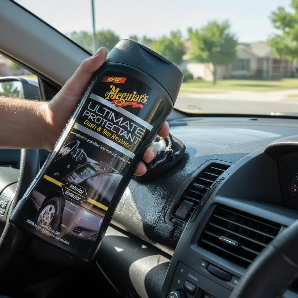 Restaura, protege y realza el color original de plásticos y vinilos tanto en el interior como exterior de tu vehículo. Gracias a su avanzada tecnología con polímeros hidrofóbicos y bloqueadores UV de última generación, Meguiar’s Ultimate Protectant ofrece una defensa superior frente al sol, la resequedad y el desgaste prematuro. Su fórmula de alto rendimiento no solo devuelve el brillo profundo y acabado como nuevo, sino que también crea una capa protectora que resiste múltiples lavados y condiciones climáticas adversas. ¡Ideal para molduras, parachoques, tableros, paneles de puertas y más! Beneficios Protección y brillo superiores para vinilos, gomas y plásticos interiores que duran semanas. Tecnología bloqueadora UV superior para una protección prolongada. Protector de larga duración que crea un brillo intenso y oscurece superficies interiores y exteriores. De secado rápido y sin terminación grasosa. Instrucciones de uso 1. Procure limpiar las superficies con cualquier detailer interior antes de aplicar el producto. 2. Aplique una pequeña cantidad de producto en una esponja aplicadora o en una toalla de microfibra limpia. 3. Con el pad aplicador humectado, aplique en la superficie que desee trabajar para acondicionar y restaurar la tonalidad perdida.