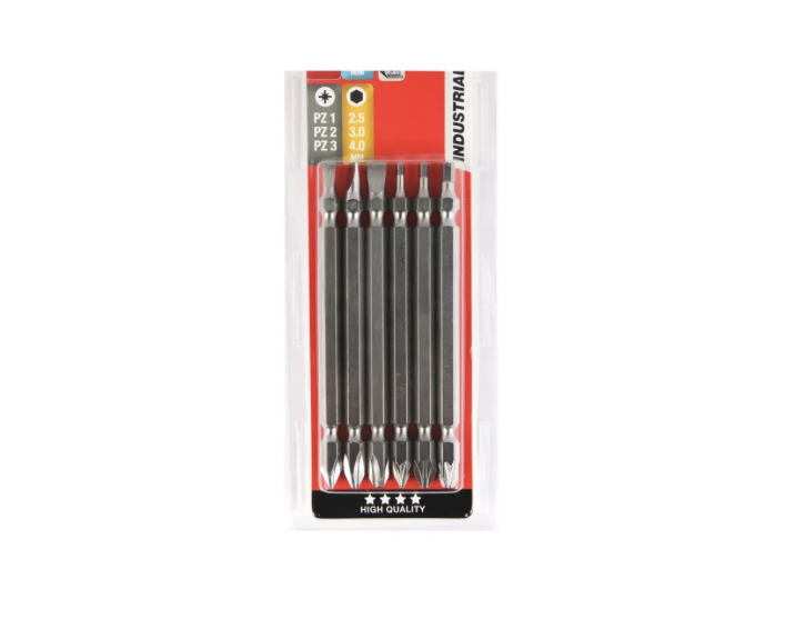 El juego de puntas dobles, de 6 piezas, contiene 12 de las tomas de fuerza más frecuentes. Está equipado para el próximo atornillamiento tan solo girando la punta en la máquina. Las puntas de 100 mm de longitud también son aptas para los tornillos a gran profundidad. Las puntas PH y PZ están equipadas con Mega Grip Ribs. Superficie con acabado satinado.