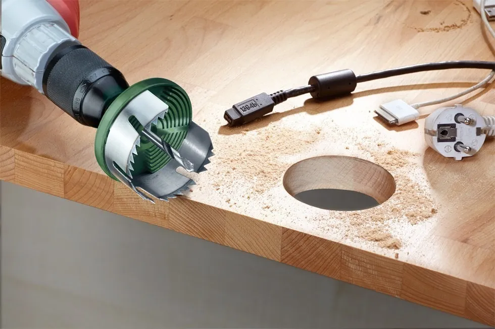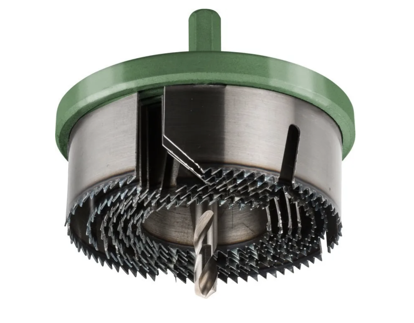 Sierra de corona, 8 piezas, plato de apoyo de zinc colado a presión, coronas de acero templado para muelles, puntas de los dientes templadas por inducción, para el uso en madera, maderas revestidas de plástico, madera dura, planchas de conglomerado, planchas de yeso encartonado, placas de construcción ligera, plástico y cobre.