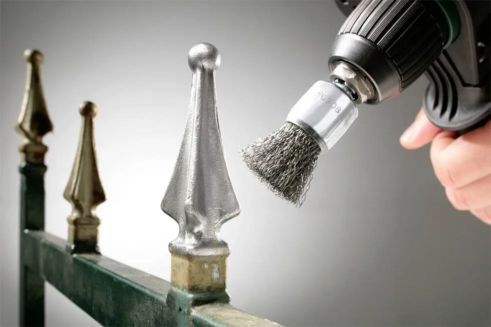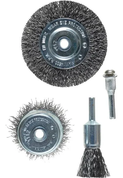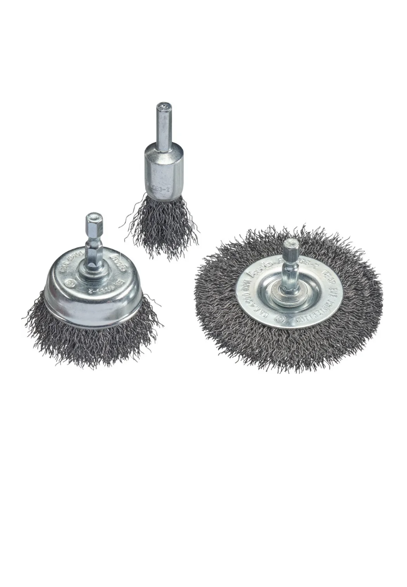 El set de cepillos de alambre kwb de 3 piezas consta de: Un cepillo circular con diámetro de 75 mm, un cepillo de copa con diámetro de 50 mm y un cepillo de cabeza de pincel con diámetro de 15 mm, respectivamente en modelo robusto con alambre de acero con un grosor de 0,3 mm. Los cepillos de alambre son aptos para la desoxidación, la limpieza y la remoción de pintura, cascarilla, incrustaciones y rebaba en metales y piedras. El cepillo circular y el cepillo de copa están equipados con un vástago de inserción hexagonal E6.3. El cepillo de cabeza de pincel está equipado con un vástago de inserción redondo.