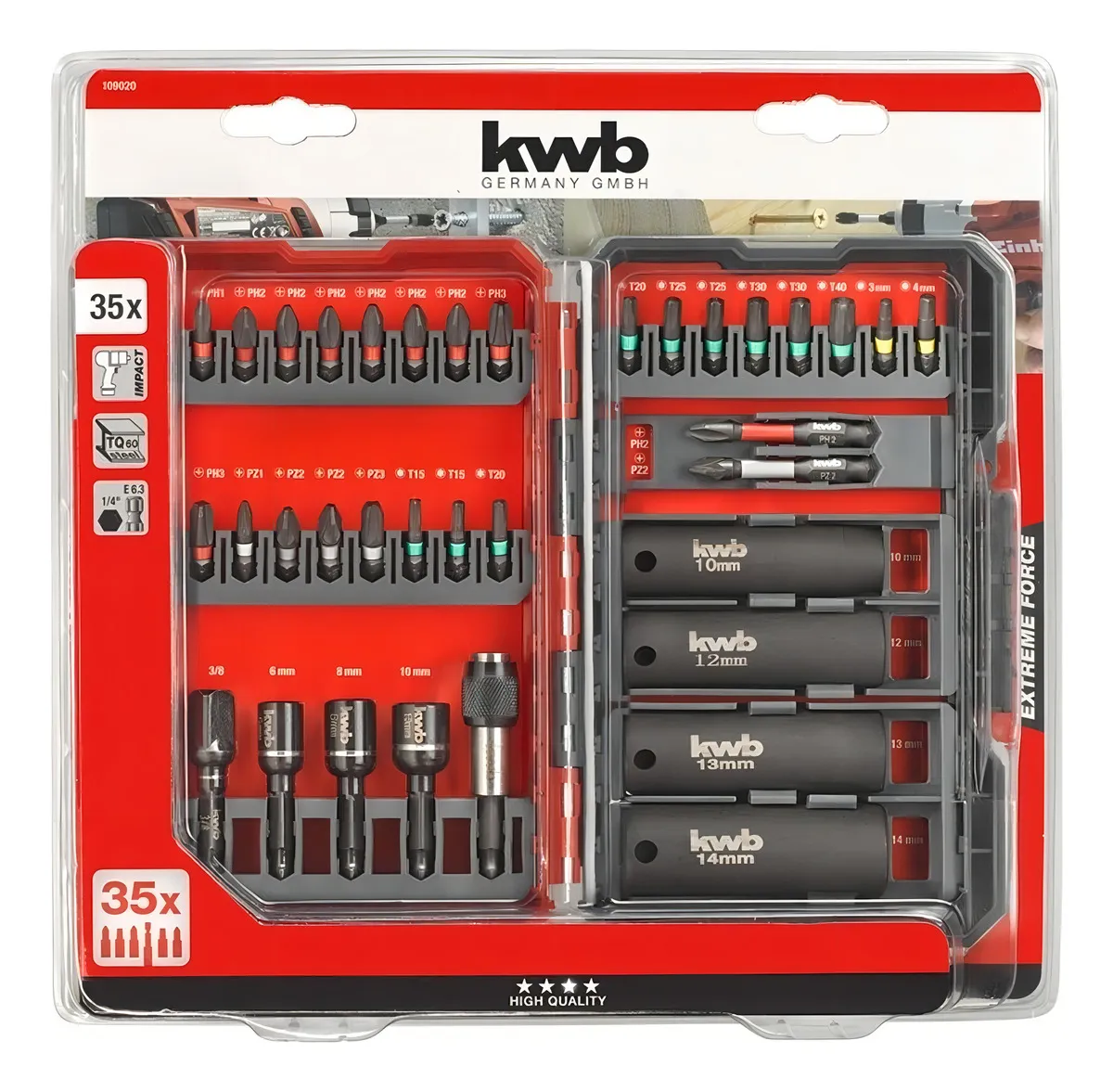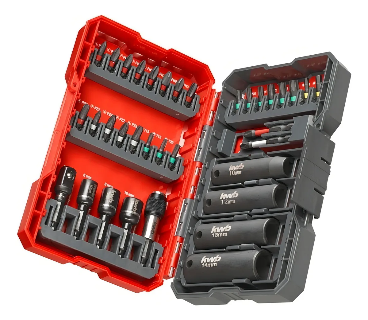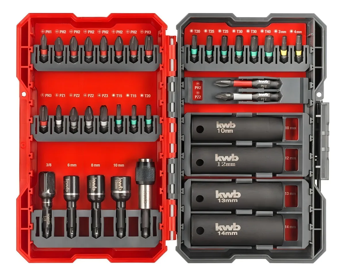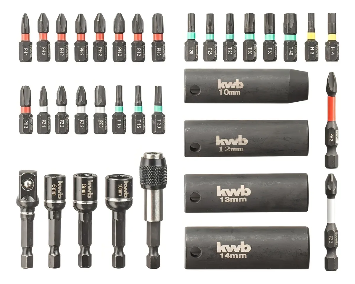 Las puntas de la caja de puntas Impact kwb son ideales para destornilladores de impacto corrientes de venta en el mercado. Gracias a la zona de torsión especial y al acero modificado, las puntas son completamente resistentes a los golpes, extremadamente duraderas y resisten sin problemas una carga continua incluso bajo condiciones exigentes extremas.