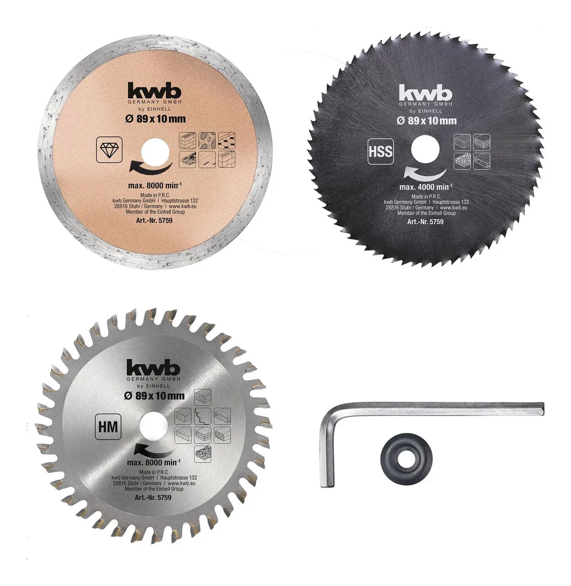 El kit de 3 hojas mini para sierra circular ofrece una hoja HSS, de 85 x 10 mm, con un máximo de 4000 rpm para trabajar con madera. Además, el kit también incluye una hoja de sierra HM, de 85 x 10 mm, con un máximo de 8000 rpm para trabajar con plástico y madera, así como una hoja de sierra de diamante, de 85 x 10 mm, con un máximo de 8000 rpm para trabajar con piedra, baldosas y azulejos de 5 mm. Como dispositivo auxiliar encontrará en el kit de mini sierras circulares una llave de pipa y una arandela.
